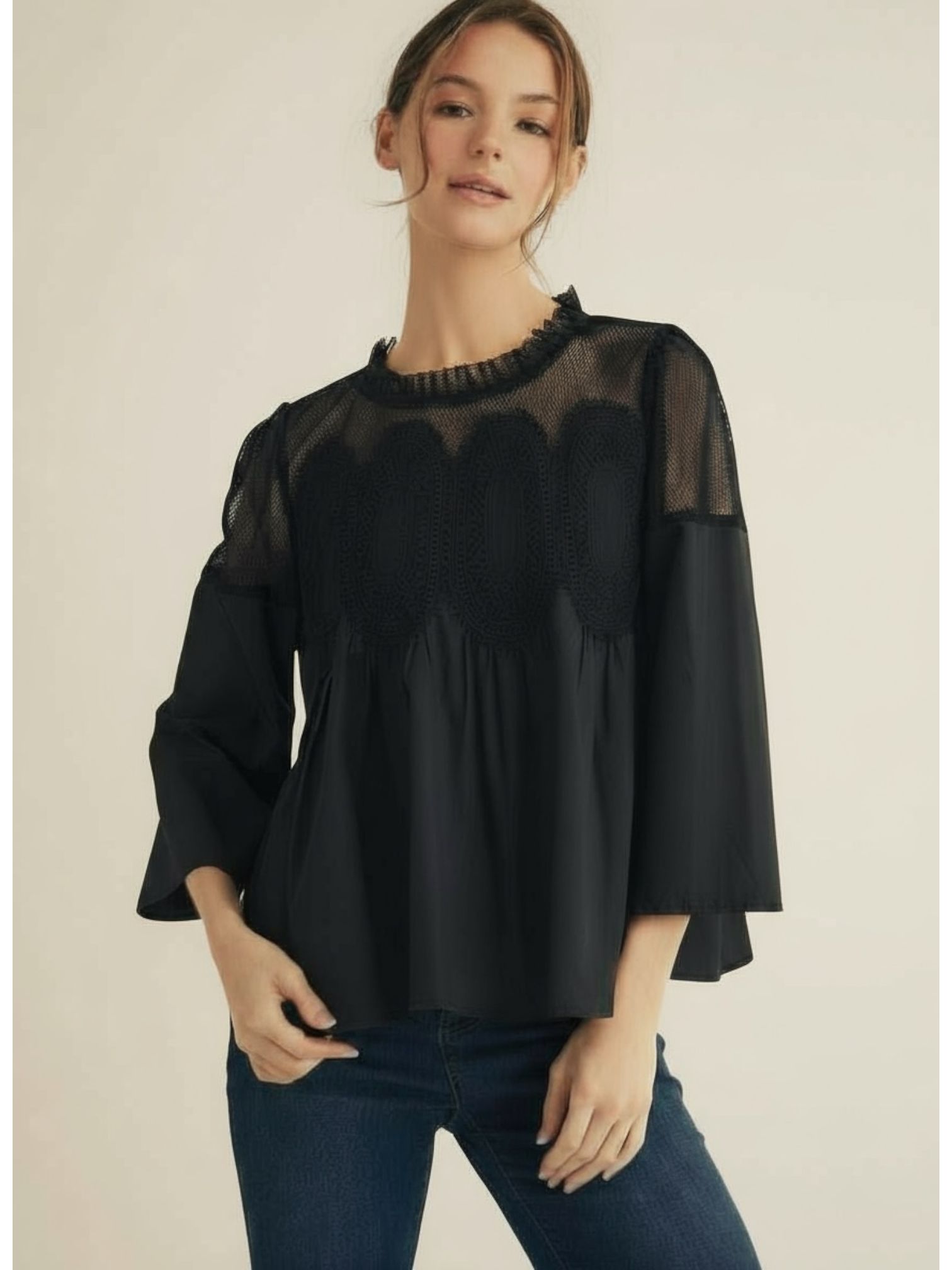 Jodifl 3/4 Sleeves Top With Contrast Crochet Accent - Black