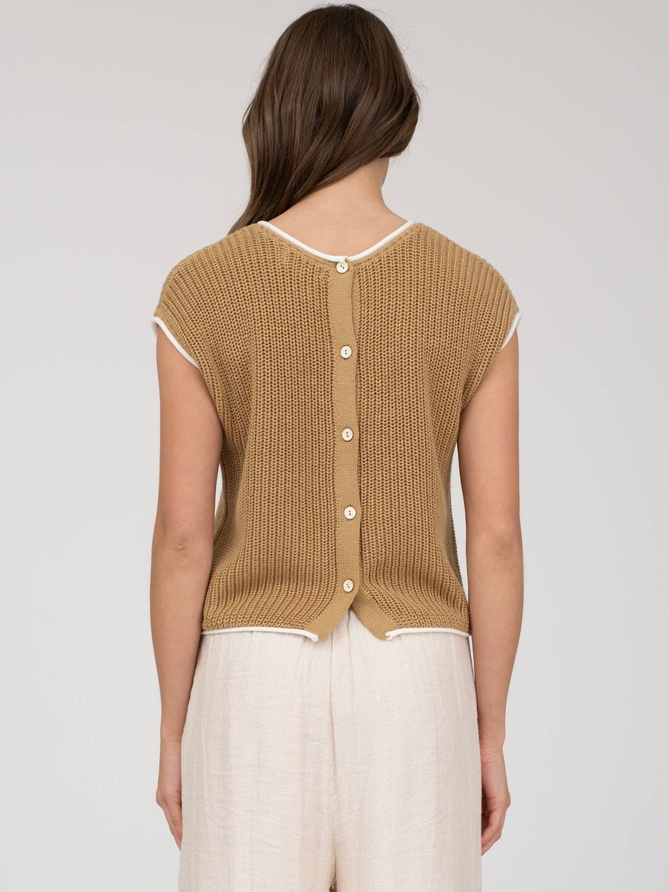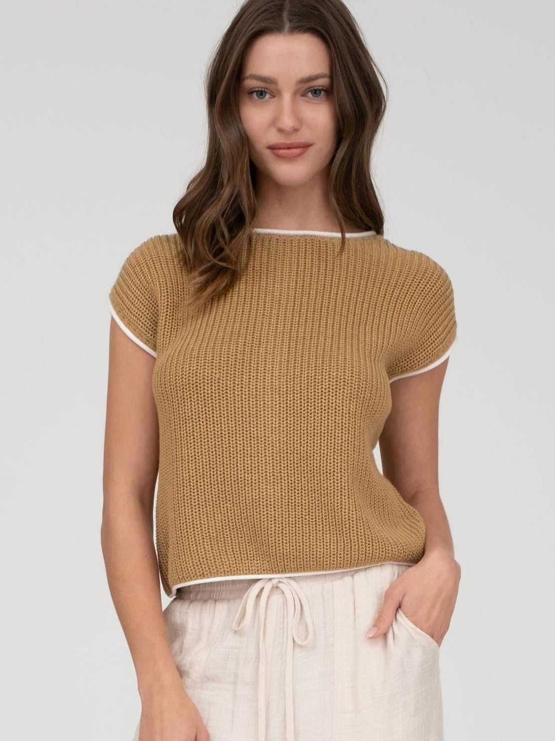 Boat neckline, short sleeves, contrast trim, sweater knit, sweater top, contrast solid, not lined.