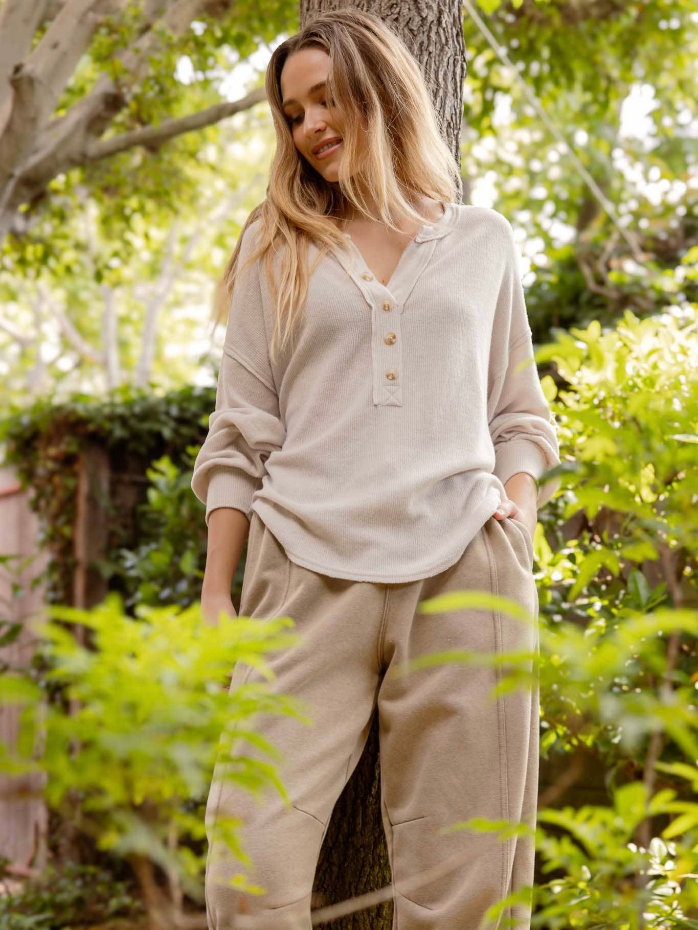 V neck half button long sleeve knit top.