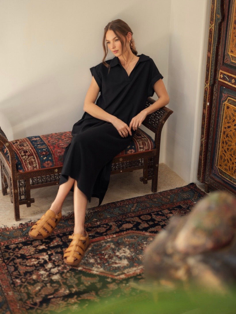 Jodifl solid midi dress with open collared neck, side pockets, short kimono sleeves, band cuffs, and side slit detail. Color: Black