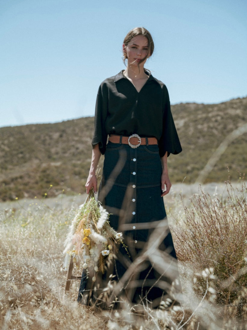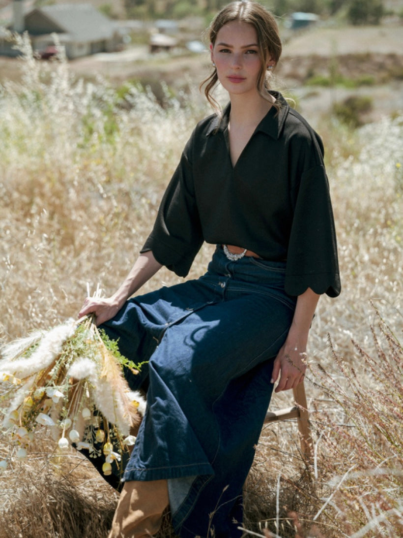 Jodifl 3/4 sleeves v neck top with scallop edge detail, collared neckline. Color:Black
