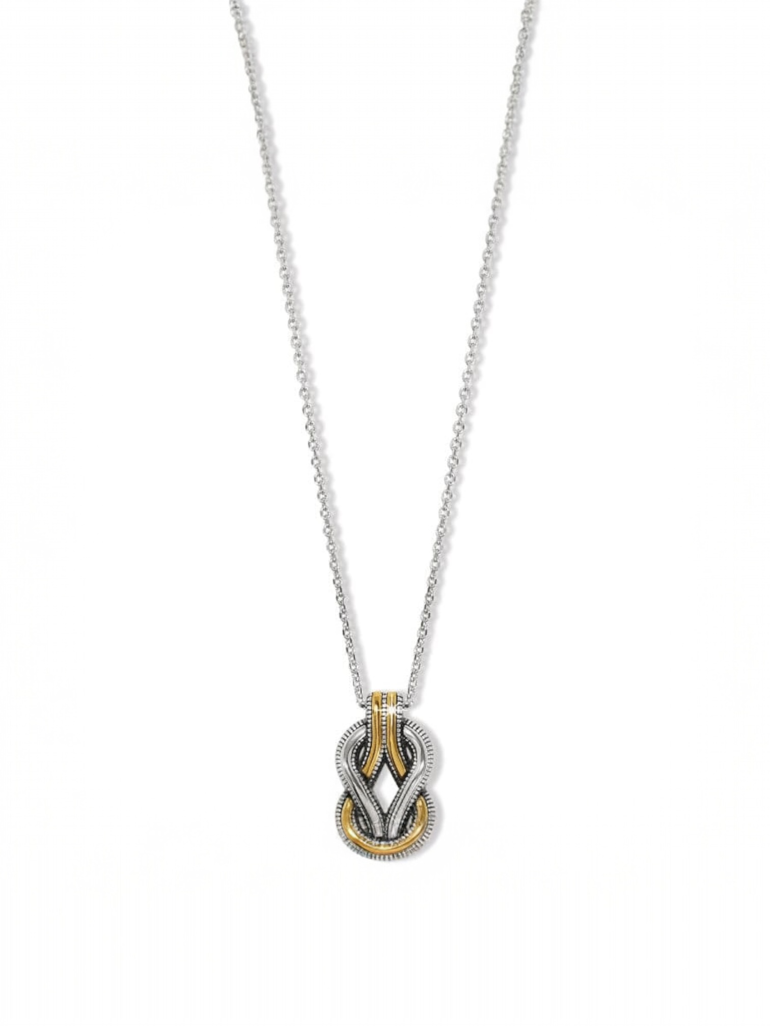 Inspired by the 3rd and 4th century Greco Roman Hercules knot which symbolizes strength, love and connection, this necklace is a modern version with a beautiful interplay of gold and silver and contoured, etched lines.