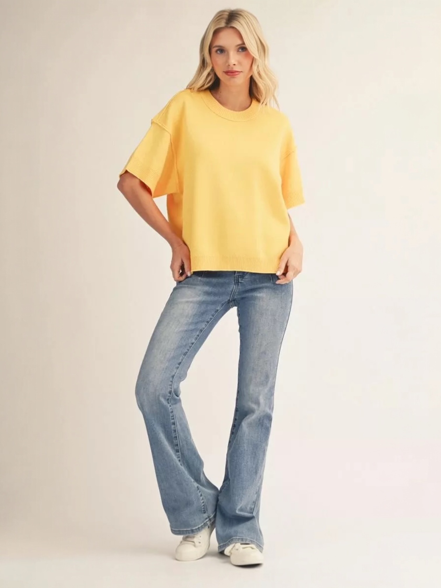 Add a bright, effortless touch to your everyday wardrobe with this Jodifl Drop Shoulder Short Sleeve Comfy Sweater Top in yellow. Designed with a relaxed silhouette and drop shoulder styling, this sweater features comfortable short sleeves and a naturally flattering drape. Raw edge detailing adds a subtle, lived-in finish that keeps the look casual yet boutique-polished.