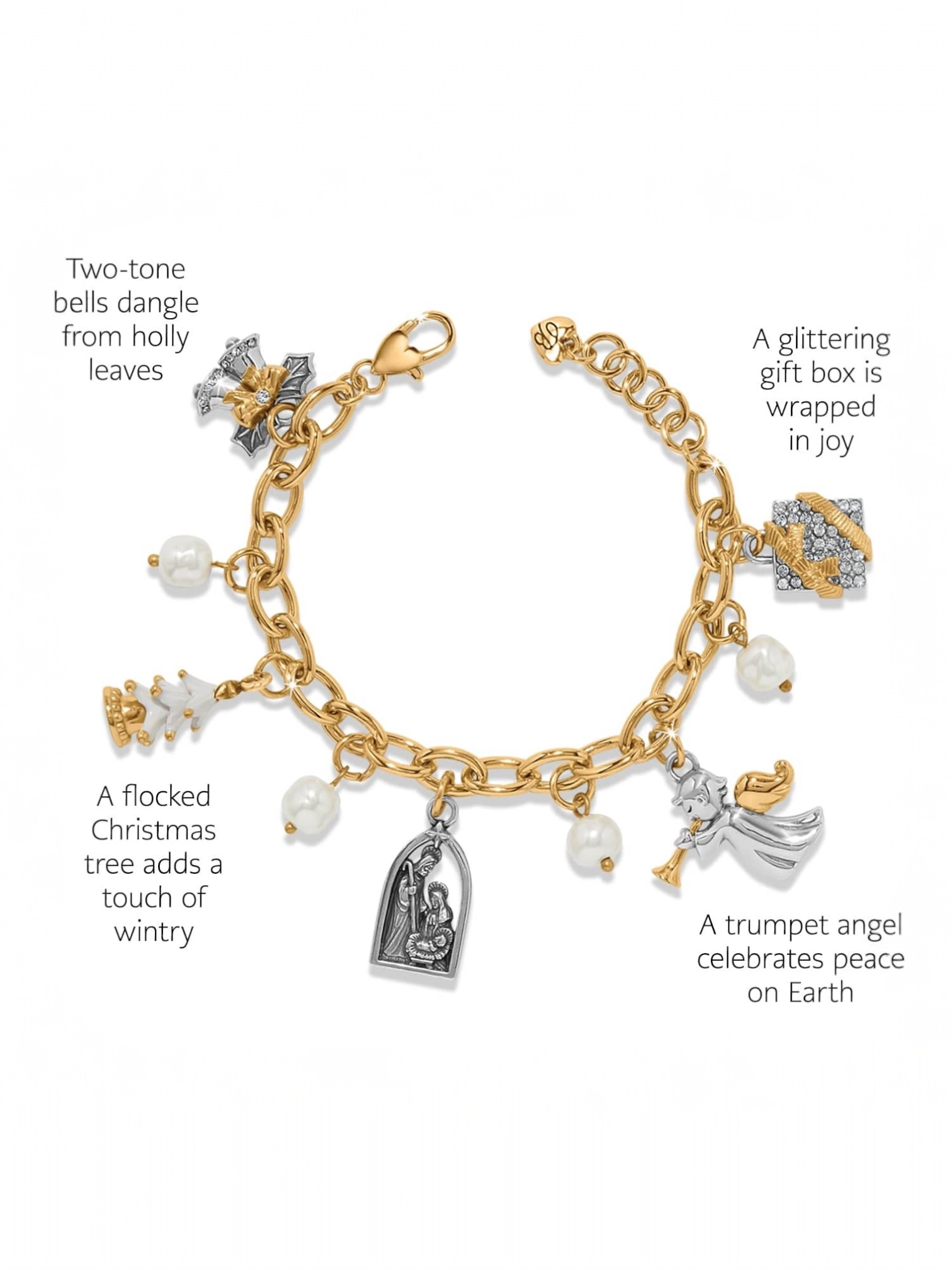Two-tone bells dangle from holly leaves, a glittering gift box is wrapped in joy, a flocked Christmas tree adds a touch of wonder and a trumpet angel celebrates peace on earth. These tender scenes of love and light make the holidays unforgettable! Have a charmed season.