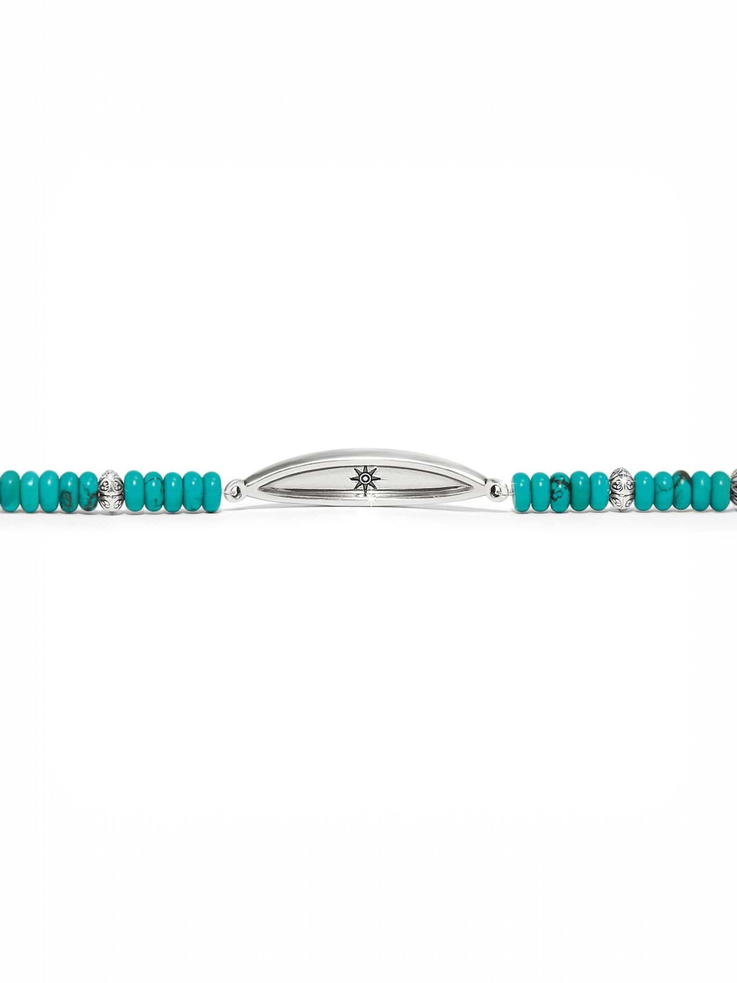 Inspired by the beauty of a vast sky, this bracelet with artisan etchings and semi-precious turquoise-hued beads gives a southwest vibe to your style.