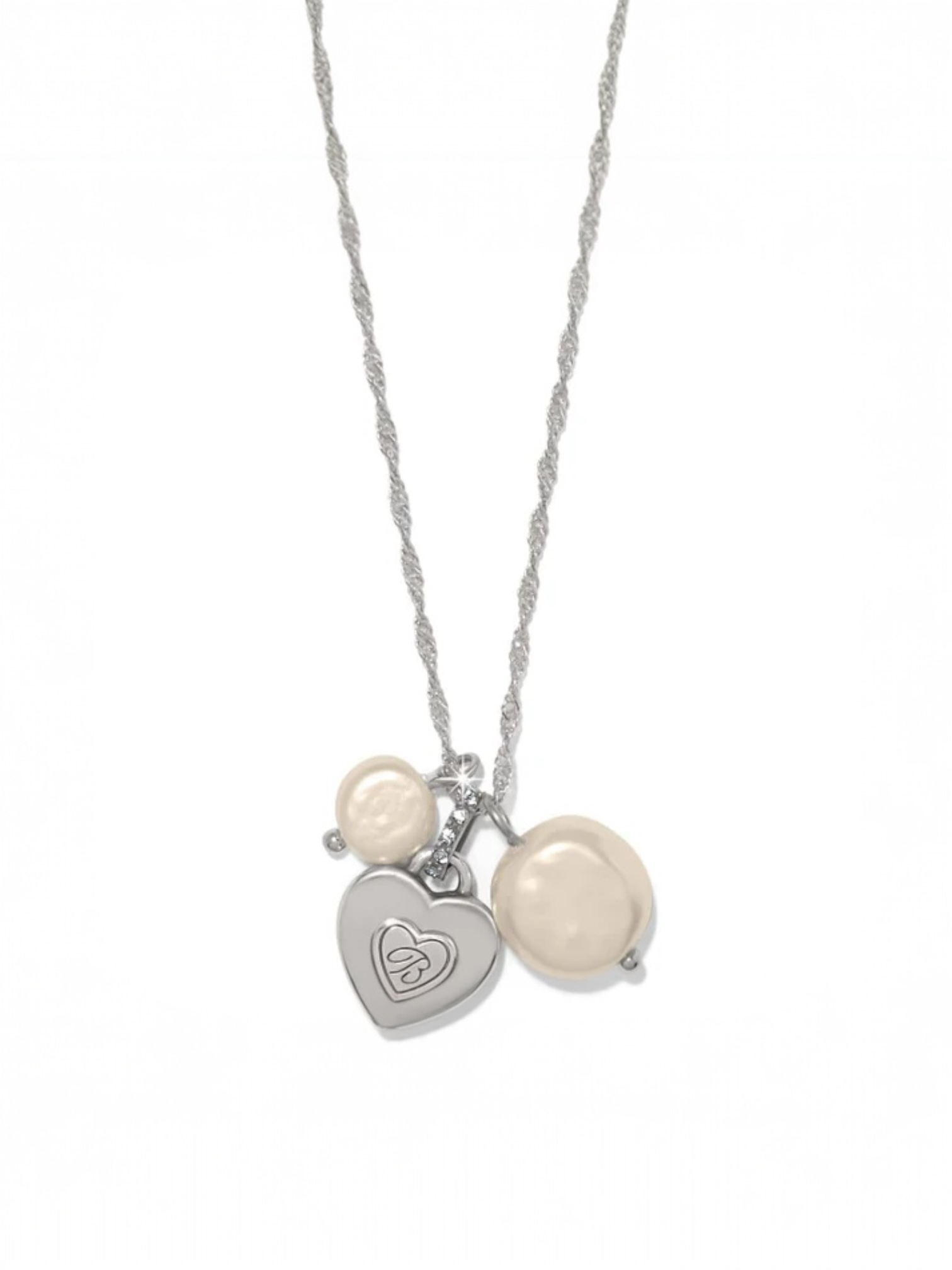 This cluster pendant continues the One Heart story with curated hearts from 20 years of Brighton design archives. The hearts, fine European crystals and handmade Japanese pearls carry a message of love.