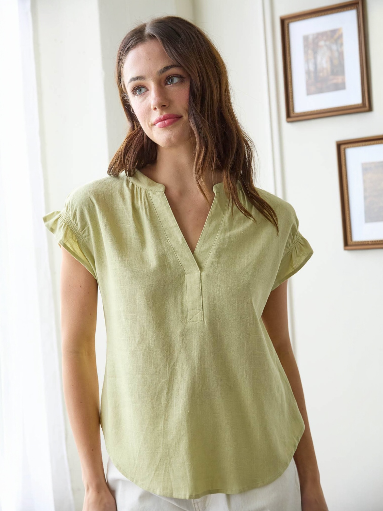 Split neckline, short sleeves, elastic ruched detail on sleeves and back, linen blend, solid not lined, lightweight woven top.