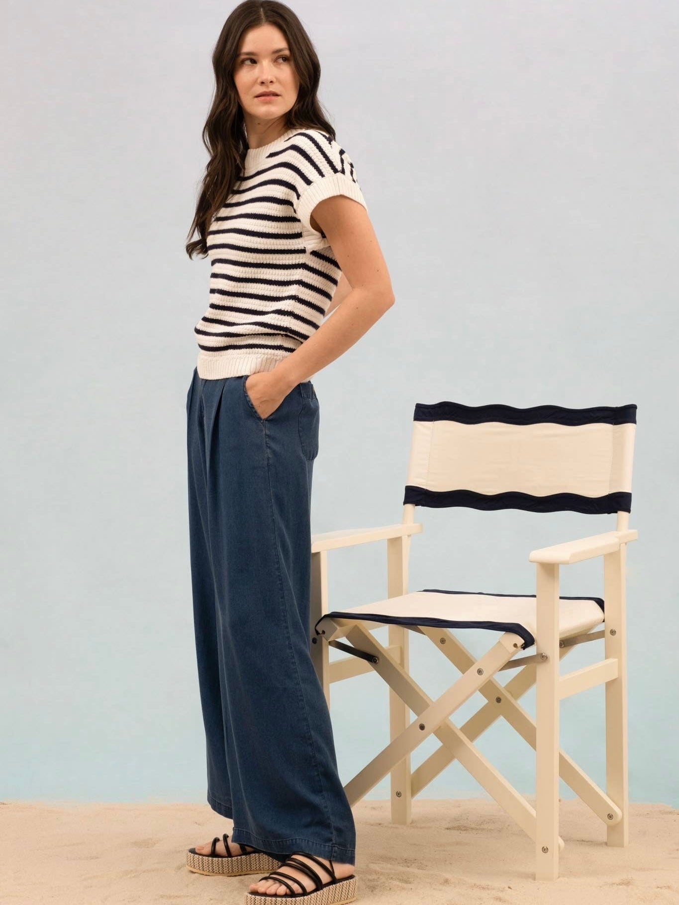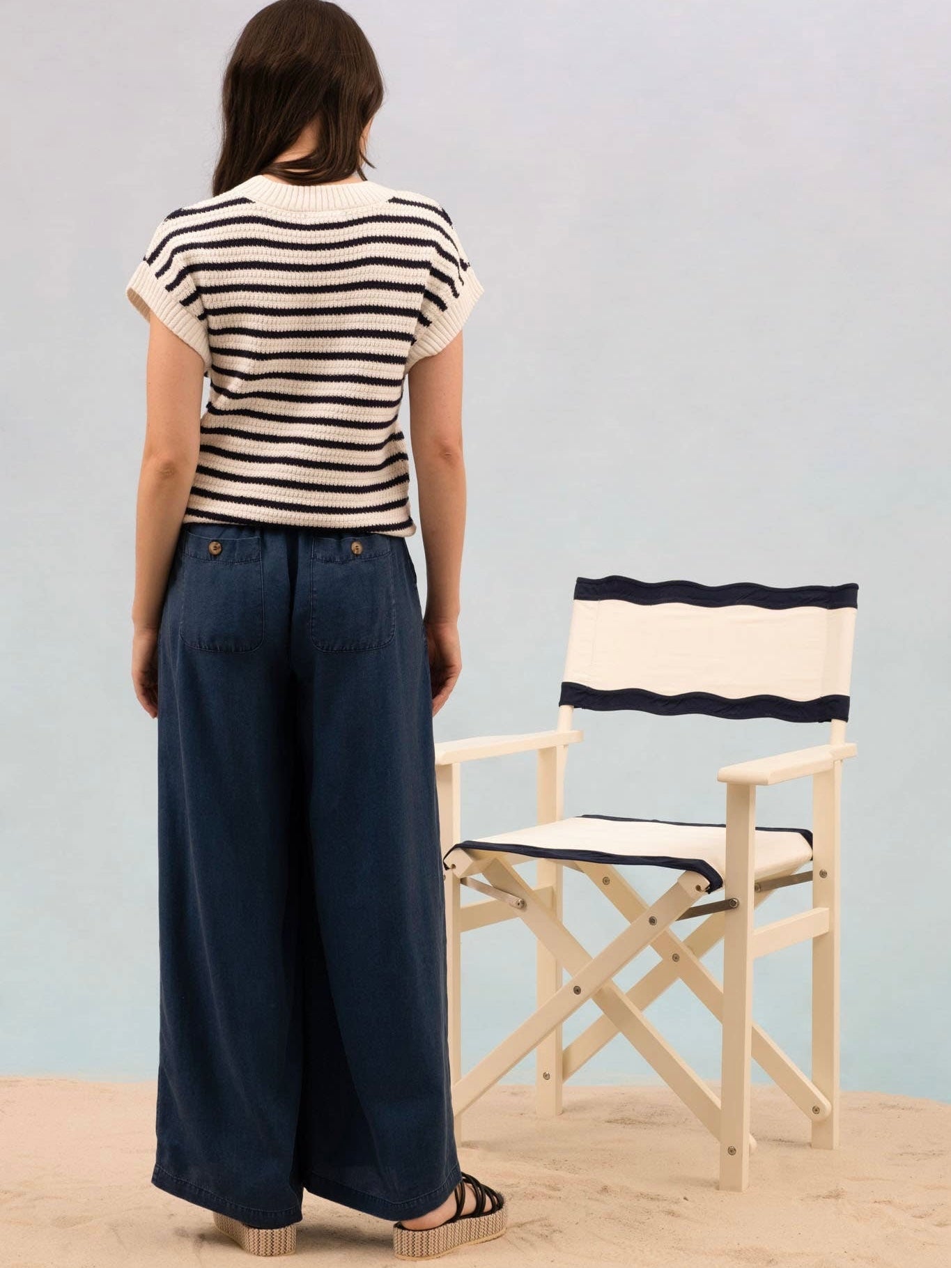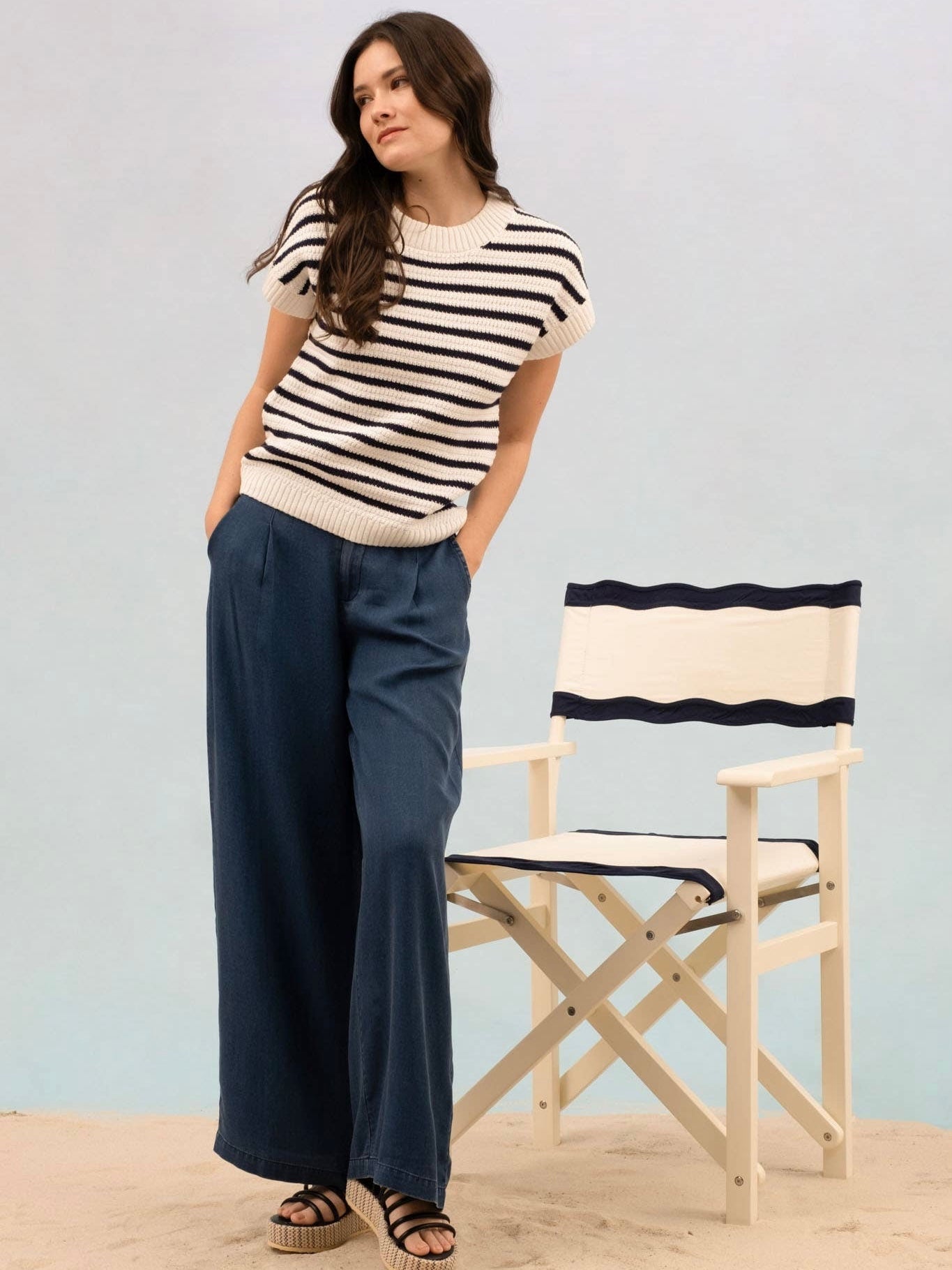 Crew neckline, short sleeves, extended shoulder, ribbed detail, relaxed fit stripe pattern, knit pullover sweater.