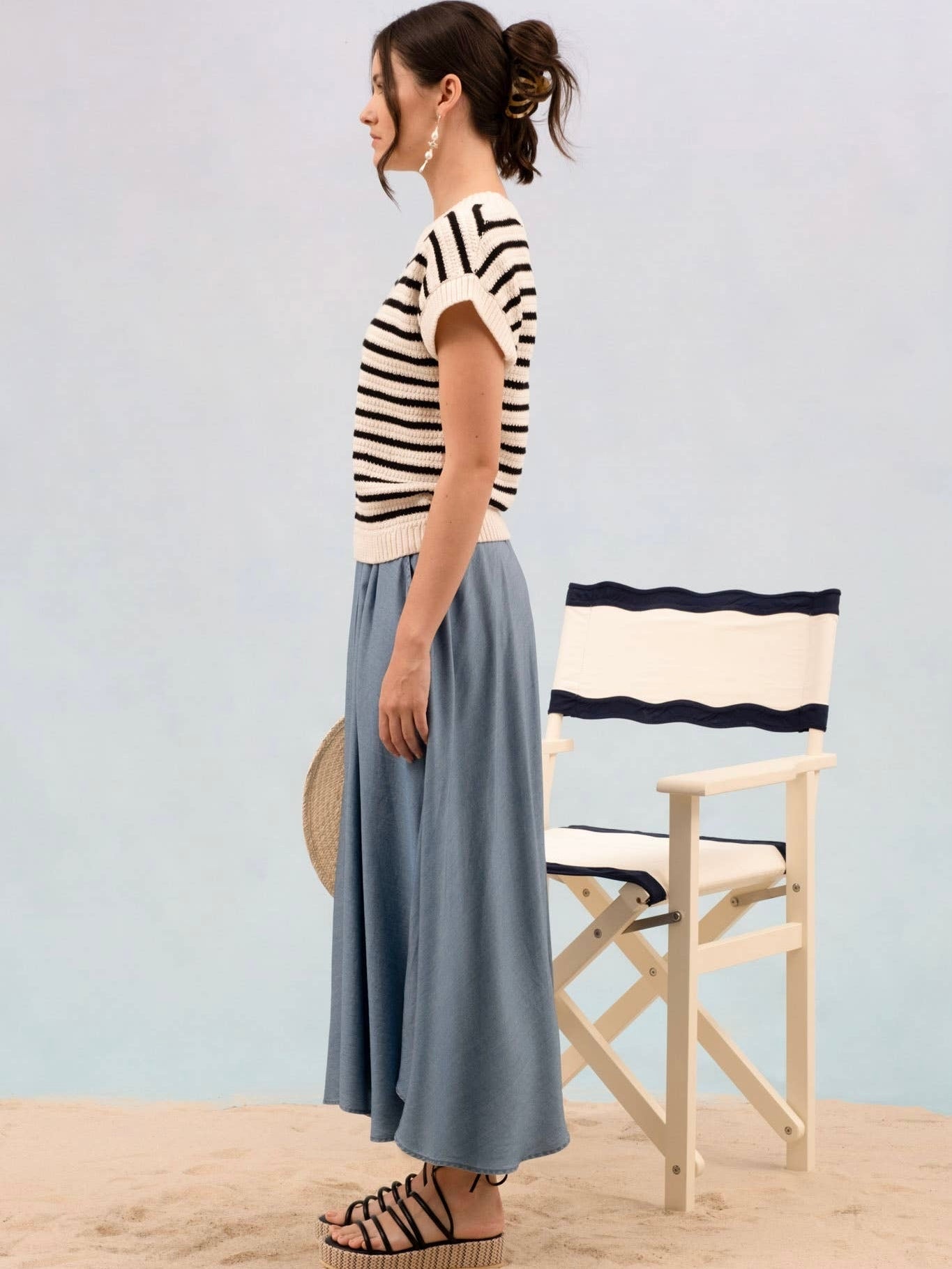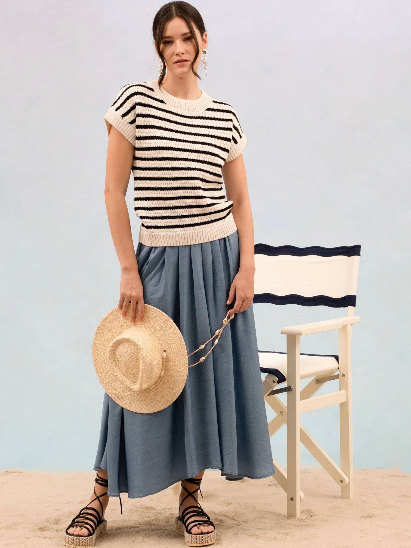 Crew neckline, short sleeves, extended shoulder, ribbed detail, relaxed fit, stripe pattern, knit pullover sweater.
